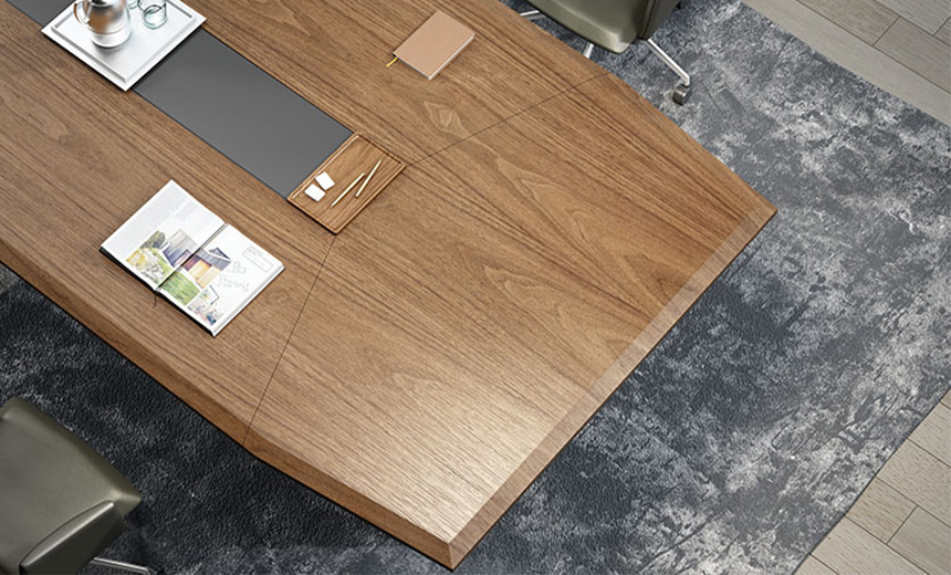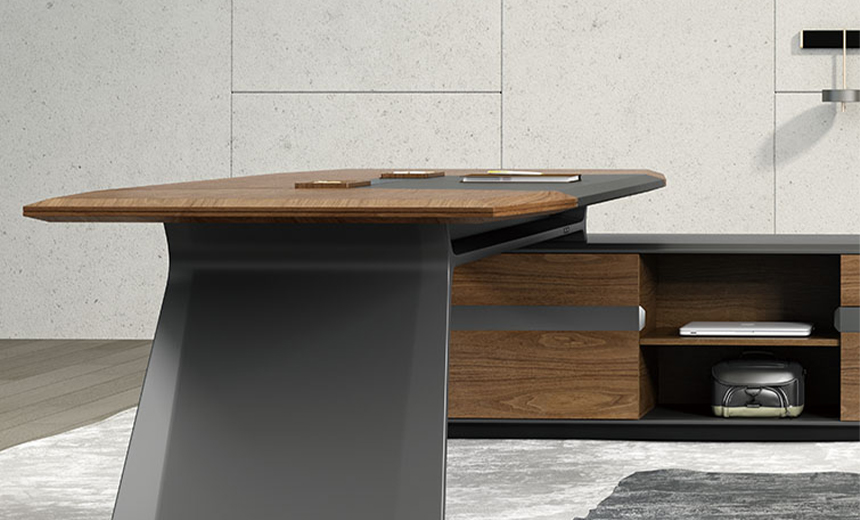 The executive desk features powerful front contours and diamond-like curves inspired by the Galaxy S8's curved display screen. Its desktop employs advanced three-dimensional wood veneer technology, creating a seamless, one-time molded surface with a natural, smooth wood texture for a refined and elegant finish.