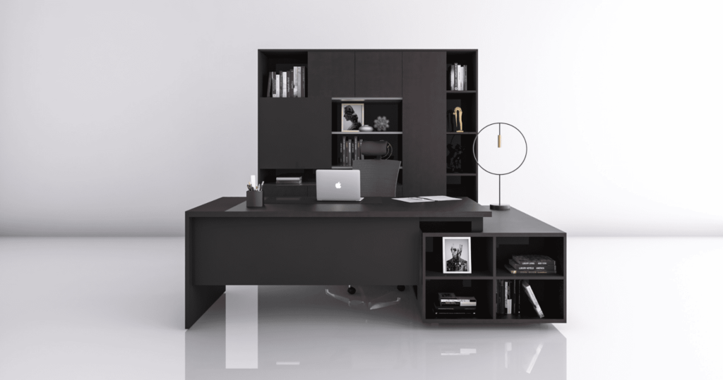 It’s vaguely modern and classic feel. Back storage are proposed in the same finishes as the desks. And with the stone pattern for door panel give more appealing.